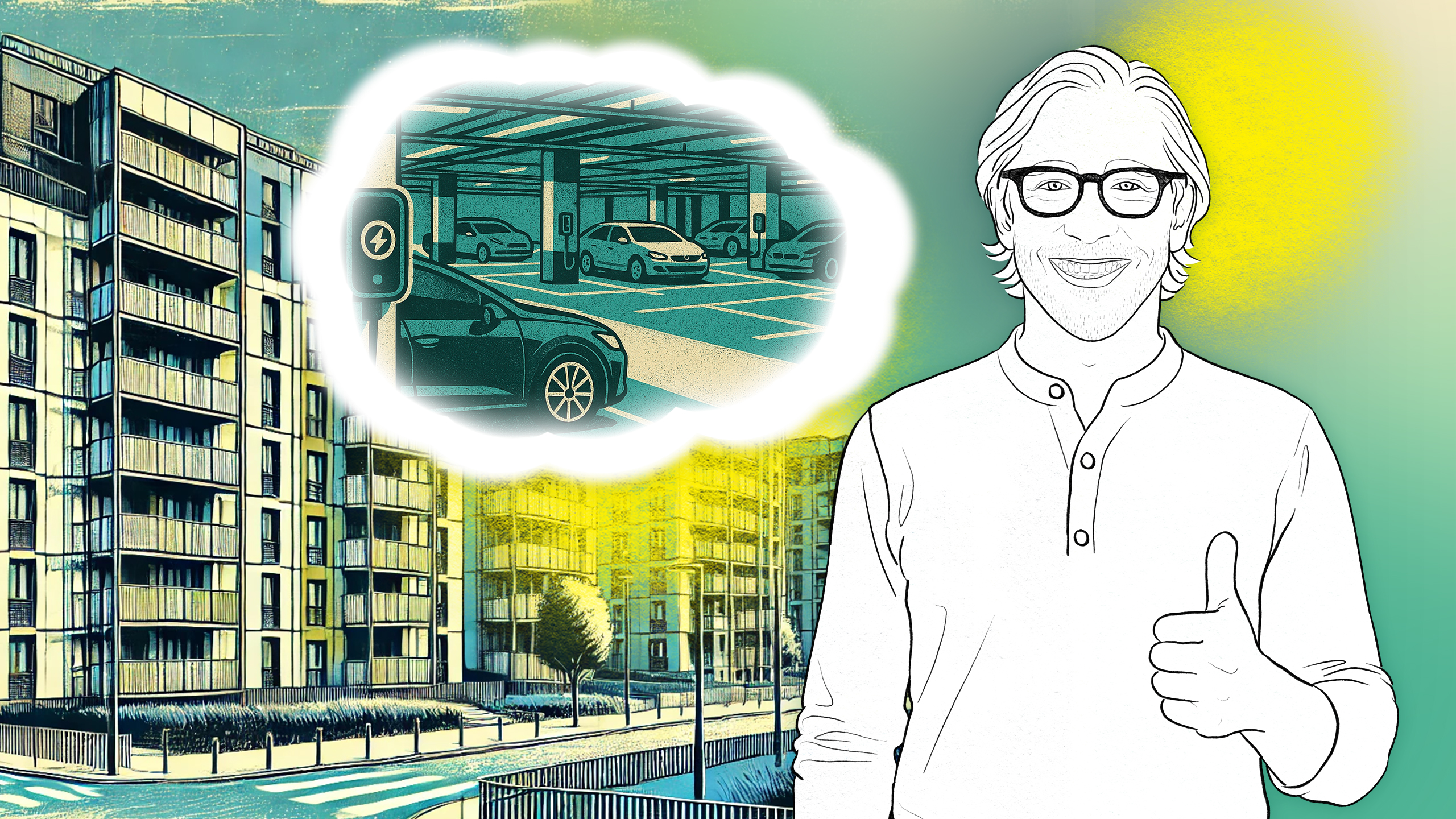 Avant d’acheter sa voiture électrique, Thomas fait installer une borne collective en copropriété. Après démarches, devis, vote et travaux, il recharge enfin son véhicule sur sa place de parking…